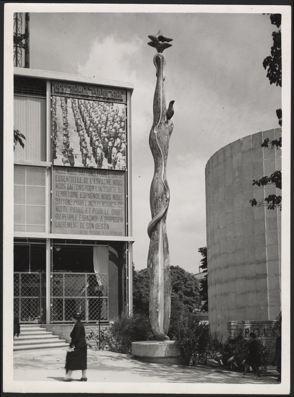 Picasso was asked by the Spanish Republican government to contribute something to their pavilion at the 1937 Paris World’s fair. This was six months into the military revolt undertaken by the Nationalists against the Republican government and involved a host of architects and artists working to produce a building which encapsulated their cause. Opposite Guernica was American artist Alexander Calder’s Mercury Fountain and in the forecourt downstairs stood the 12m tall sculpture El pueblo español tiene un camino que conduce a una Estrella, The Spanish People Have a Path that Leads to a Star by Alberto Sánchez (pictured below). The façade was covered by photomurals designed by Josep Renau presenting the traditional dress, industries and topography of the various regions of Spain.
