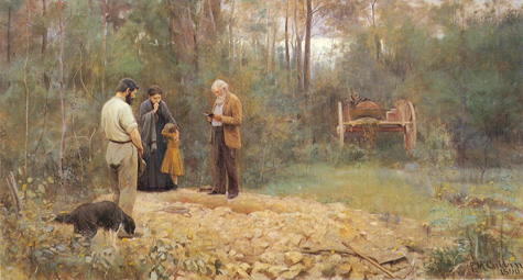 The land in question was Wurundjeri Woi Wurrung land. Not far from expanding Melbourne suburbs, McCubbin chose a spot near Box Hill (its name imported from England, memorable (to me) as the ill-fated picnic destination in Jane Austen’s Emma). In fact, he painted the figure of the down-on-his-luck prospector in his studio, modelled by his artist mate Louis Abrahams. Similarly A bush burial features a mock grave dug by McCubbin himself with friends and Mrs McCubbin as models.4 These selective elements coming together to produce paintings which critics have found compelling for many years, one critic asserting the latter ranking higher than Down on his luck.
