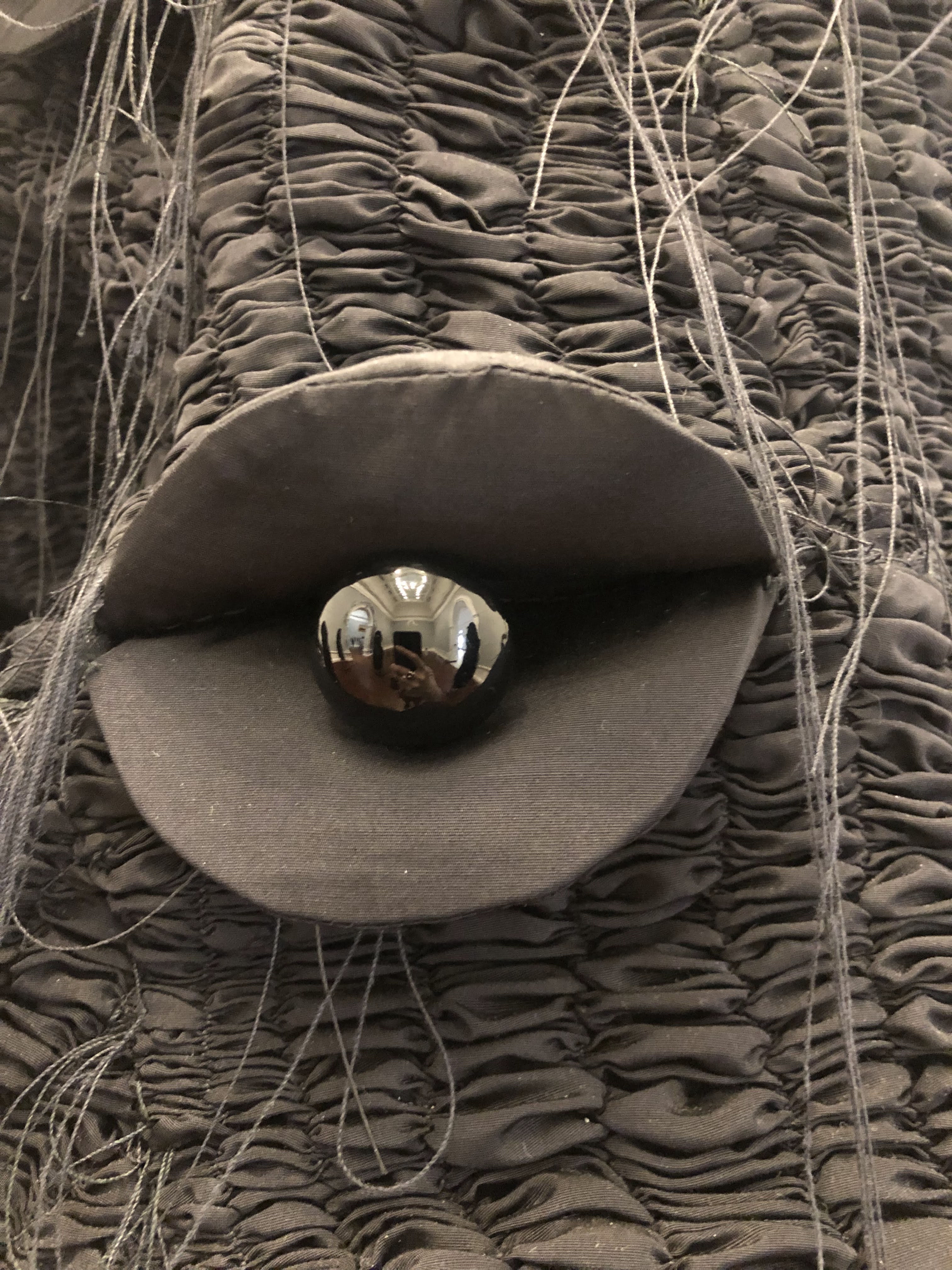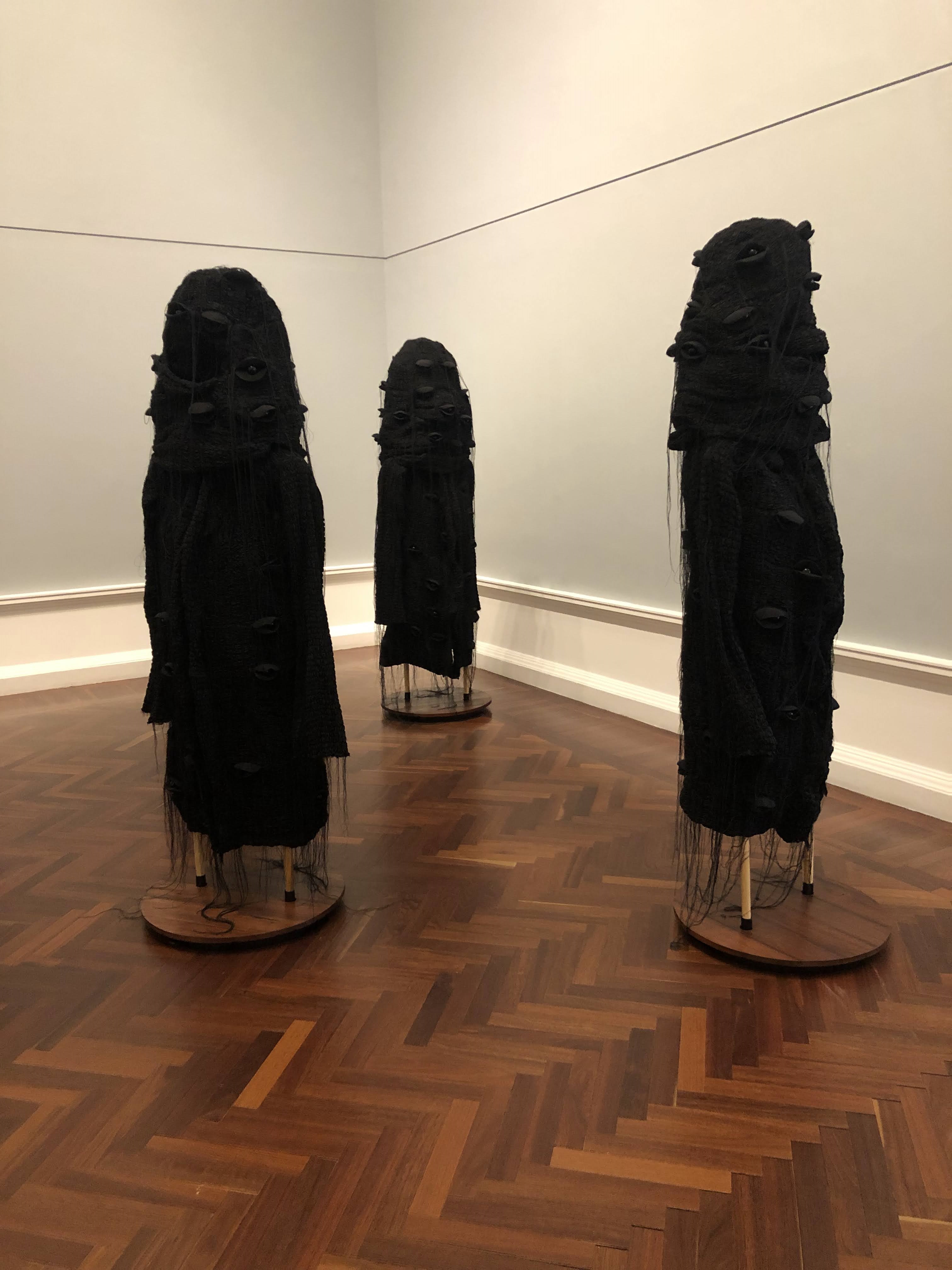 Taking up half a room on the way to the colonial furniture, jewellery and paintings, these tall hairy figures watch you enter from shiny black eyes. Stitched into thick crinkly-textured jacket shapes using over 400 meters of black silk, the Banksia men have arms and hooded heads, but no discernible faces. They are covered in over 100,000 knotted threads which hang from this detailed surface like monochrome cobwebs. It’s the many eyes, though, that really create the unsettling feeling. There are over 450 of them, each with silk lids, positioned over the Banksia bodies at angles looking all directions.