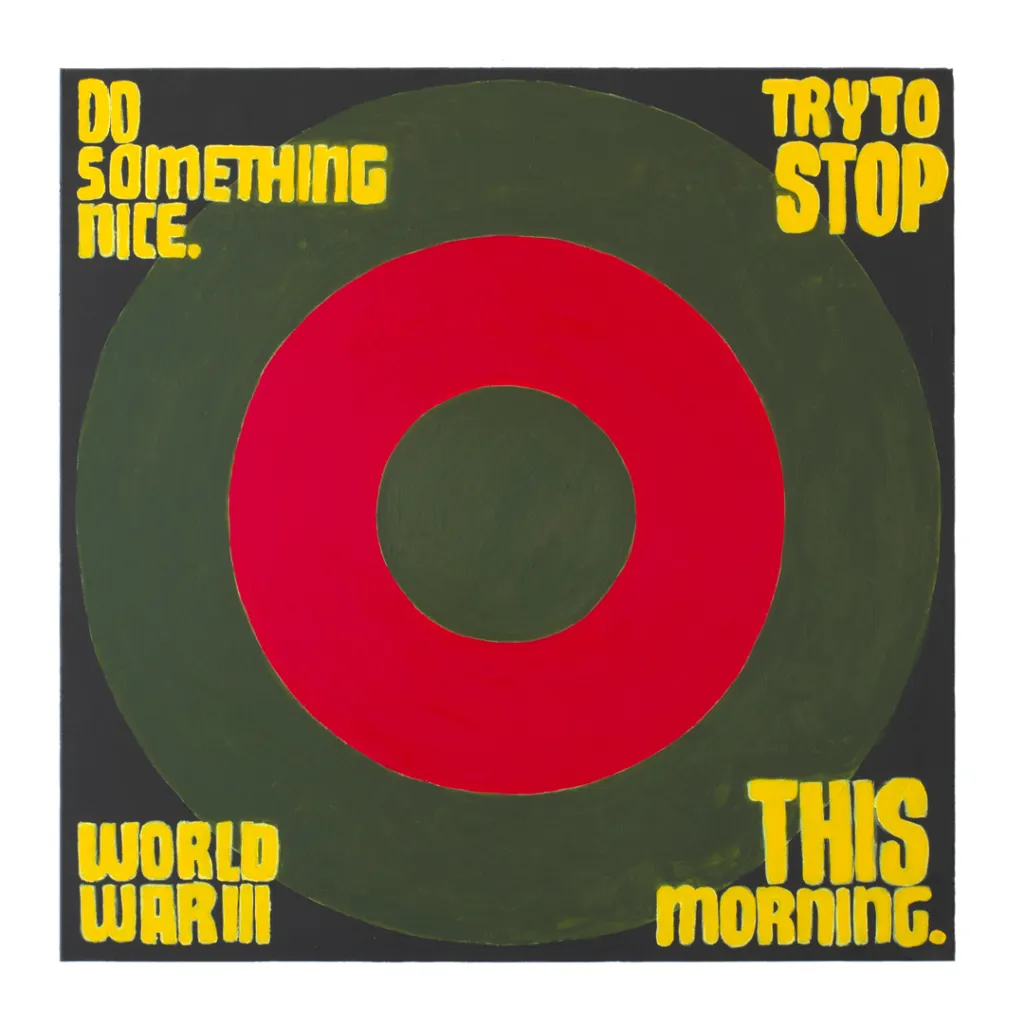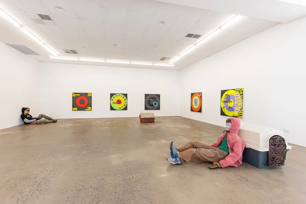 The paintings all adhere to a target format with circular colours on black backgrounds. With an unfinished air to them, these works have a roughness and practical quality of thinking through concepts without getting bogged down in the perfect finish. Along with the mullet wigs on the floor figures, the exhibition honours its location and the many excellent hairstyles of working class Mildurans.1 These paintings are filled with a coded visual language but a decidedly anti-elitist one. The eponymous painting taking the word speedway from Timmis Speedway, Mildura, A local icon of entertainment since 1964.