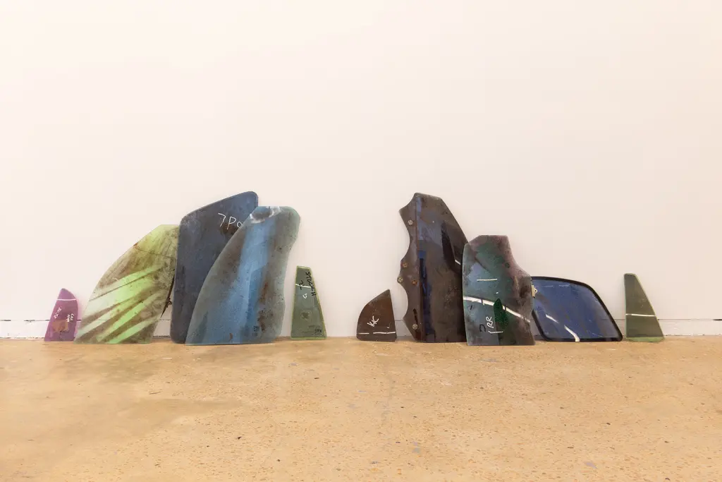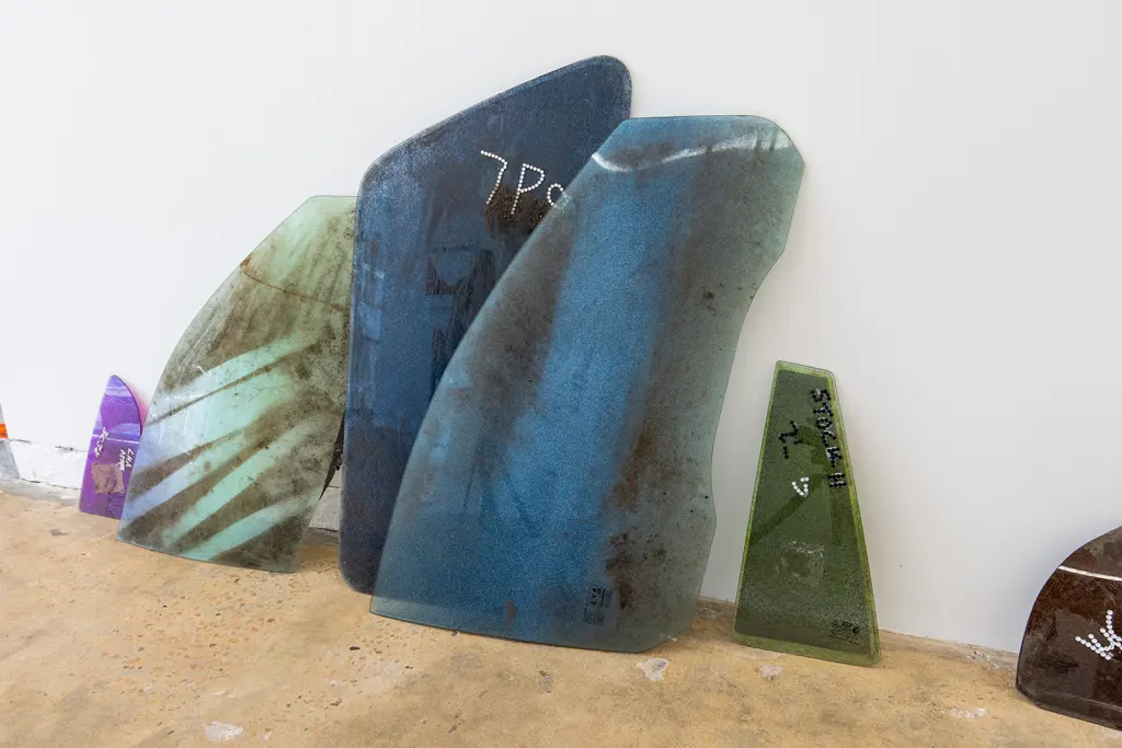 Also drawing parallels between repurposed car aesthetics is Lauren Burrows Exiguous plains a group of car windows of different sizes and shapes. Painted with a Eucalyptus-derived bio glitter, the shards of glass with neat edges speak of nail art and a very different shiny surface. Many satisfying parallels can be drawn between the often-masculine love of a car’s sparkling paint job and the effort and pride (predominantly) women put into their nails. Burrow’s windows have a gritty and aged appearance and the diamantes arranged on their surface are askew, as though stuck on by a distracted 5-year-old.
