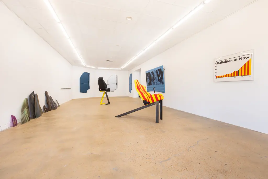 Curator Helen Hughes has responded sensitively to Mildura as an important part of NAP Contemporary’s identity. Taking into consideration the former life of the gallery space, as well as the ongoing importance of vehicular culture in the regional city, the exhibition features both local artists and those from further afield. Burchill and McCamley present the heavy lifting on a climate damaged through resource extraction with their mounted car seats, shooting upwards into the space on metal frames. A red and yellow striped seat jets in the direction of a nearby temperature chart as though on its own personal rollercoaster.