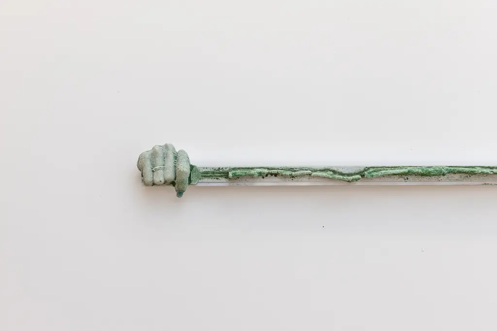 Burrow’s other work Negative Content (2023) makes tangible any sense of latent violence. Using plaster and medical impression foam, the artist has rendered the action of keying someone’s car, in three-dimensions. A small fist sits at one end of the long jagged, sparkly object. Sitting low on the wall, curator Helen Hughes confirms this is ‘to indicate surreptitious execution’.2