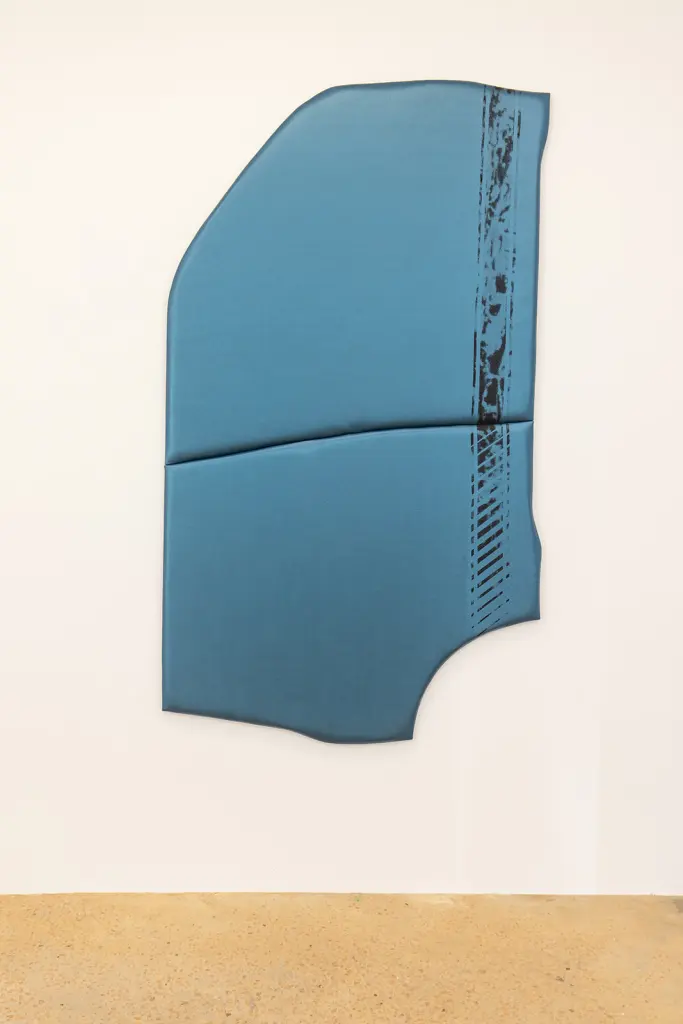 Mildura’s automotive culture also finds resonance in Alexandra Peters’ wall mounted vinyl artworks. Taking inspiration from her own Subaru Forester and the shape of the doors, she has rendered their hard surface and model-specific colours in a soft but durable industrial fabric complete with screen printed speed stripe. Marketed to women in particular, the artist’s own Forester forms the template for one of the vinyl pieces, the others representing newer models. The car-ness of their shapes, though turned on their sides, adds to the large scale of the works and brings to my mind interesting questions about car ownership and automotive identity. The Forester isn’t as prevalent in Sunraysia as the larger ute-style 4WDs, but this doesn’t mean less women are driving.