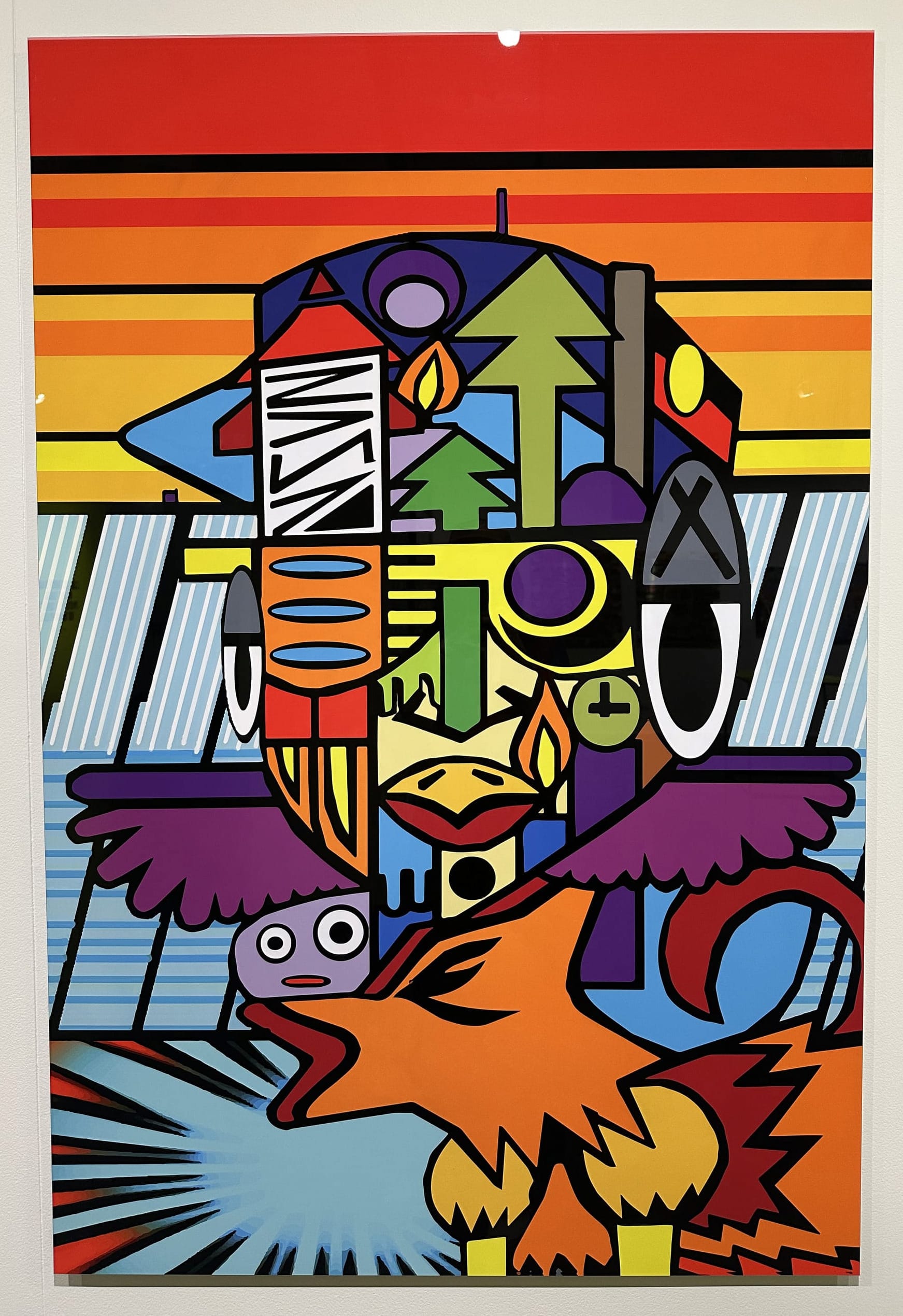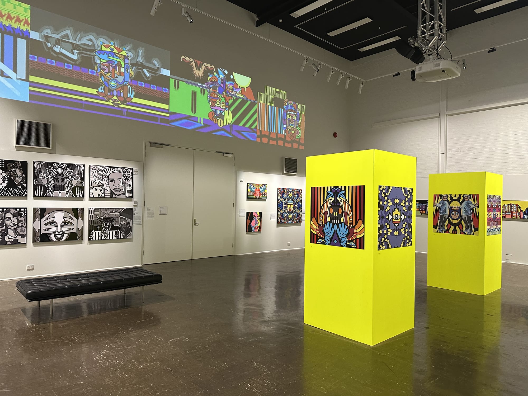 Music plays in the gallery space and I groove along with the beat. I’m not embarrassed to do so, there are only two other people in the space and one of them is the gallery attendant tapping away on a tablet. The artworks really only make sense with the music going. Their colours are best described as loud or bold and there’s heavy use of black to make certain colour combinations pop. It’s a mix of female vocals “keep on dreaming” and a male rapper with a strong, Aussie twang declaring “you’re the future”. Remixed specifically for the exhibition, the song is Bunjil’s Child by DJ Sadge (Dylan Clarke).