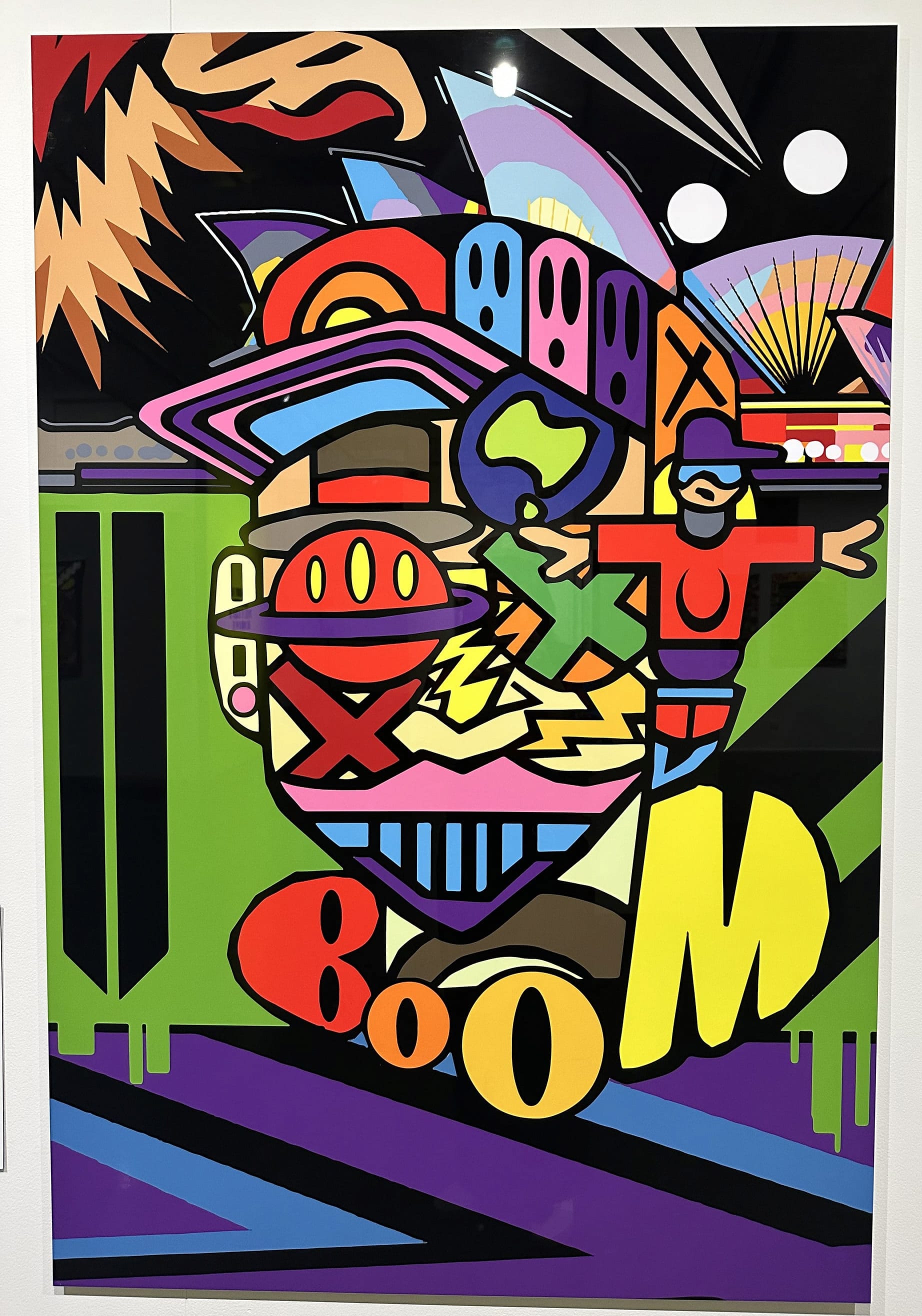 In a self-portrait series of 8 digital prints on aluminium, four of which are exhibited in this exhibition, the musical quality comes to the fore. In MOOB (2018) we see elements of a face, a baseball cap with the Sydney Opera house sails along the top, not unlike a mohawk. The face is composed of symbols slotted together, some are familiar (a top hat, a map of the country), others are strange (the planet Saturn with three yellow eyes?). A mini scarecrow-like man, also wearing a baseball cap, is positioned along the cheekbone and the word BOOM pulses under the figure’s head. Wet spray paint, flashing lights in the dark, a winged beast and a coffin are also present around the head, alongside lightning bolts and Xs. It’s busy and arresting and filled with the iconography Muir developed in his short career.