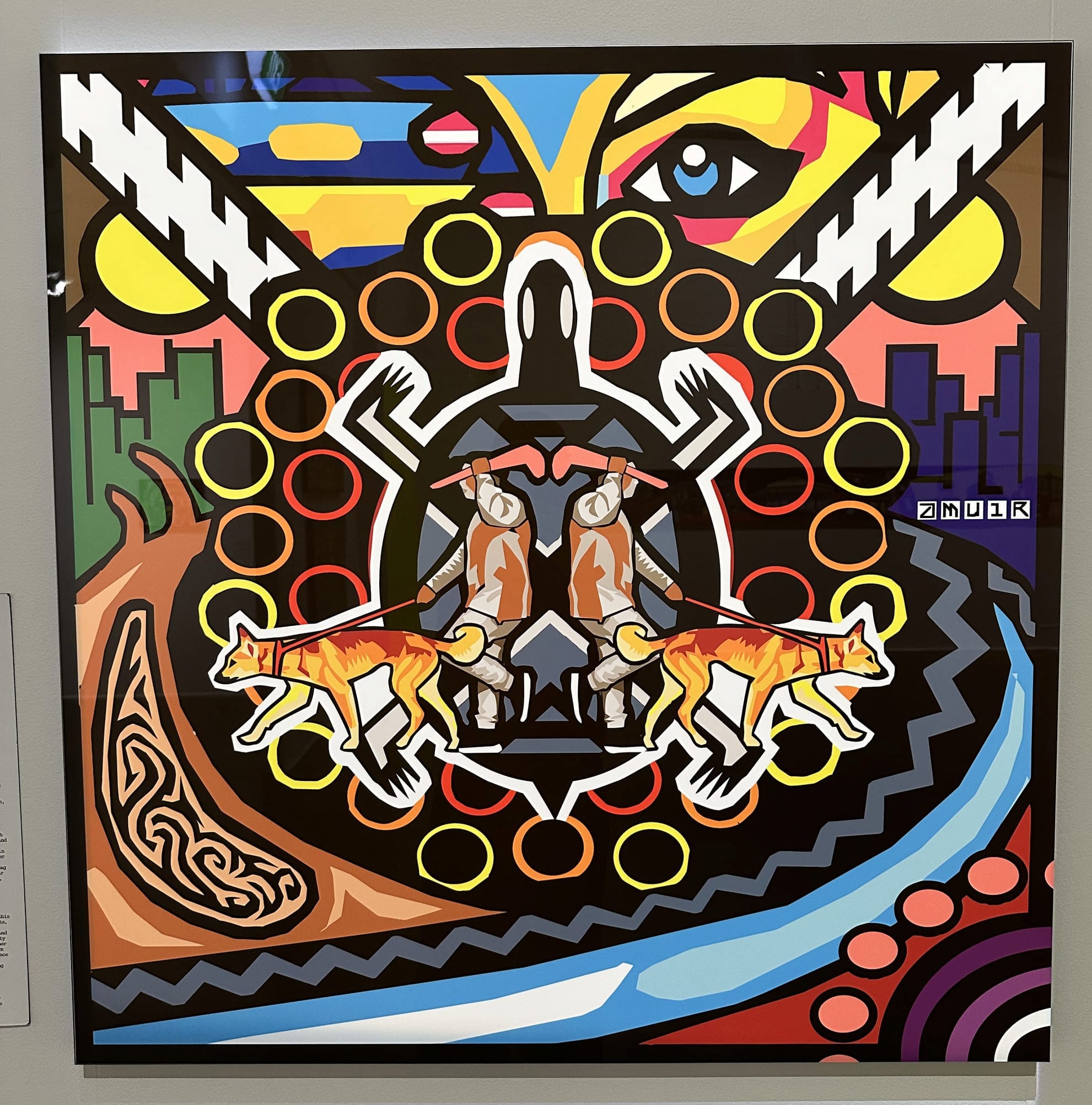 This work also introduces another icon connecting us to hip hop, America, and popular culture: a NASA rocket. Subtly disguised on the left of the figure’s face, the rocket makes the subject of this portrait explicit, the Moon, which has been reversed in the work’s title. The aspirational and transcendent beats reverberating through the exhibition serve to underscore this series of portraits all the more, I think. It’s joyful, appropriative, but also deeply connected to the lived realities of Indigenous youth.