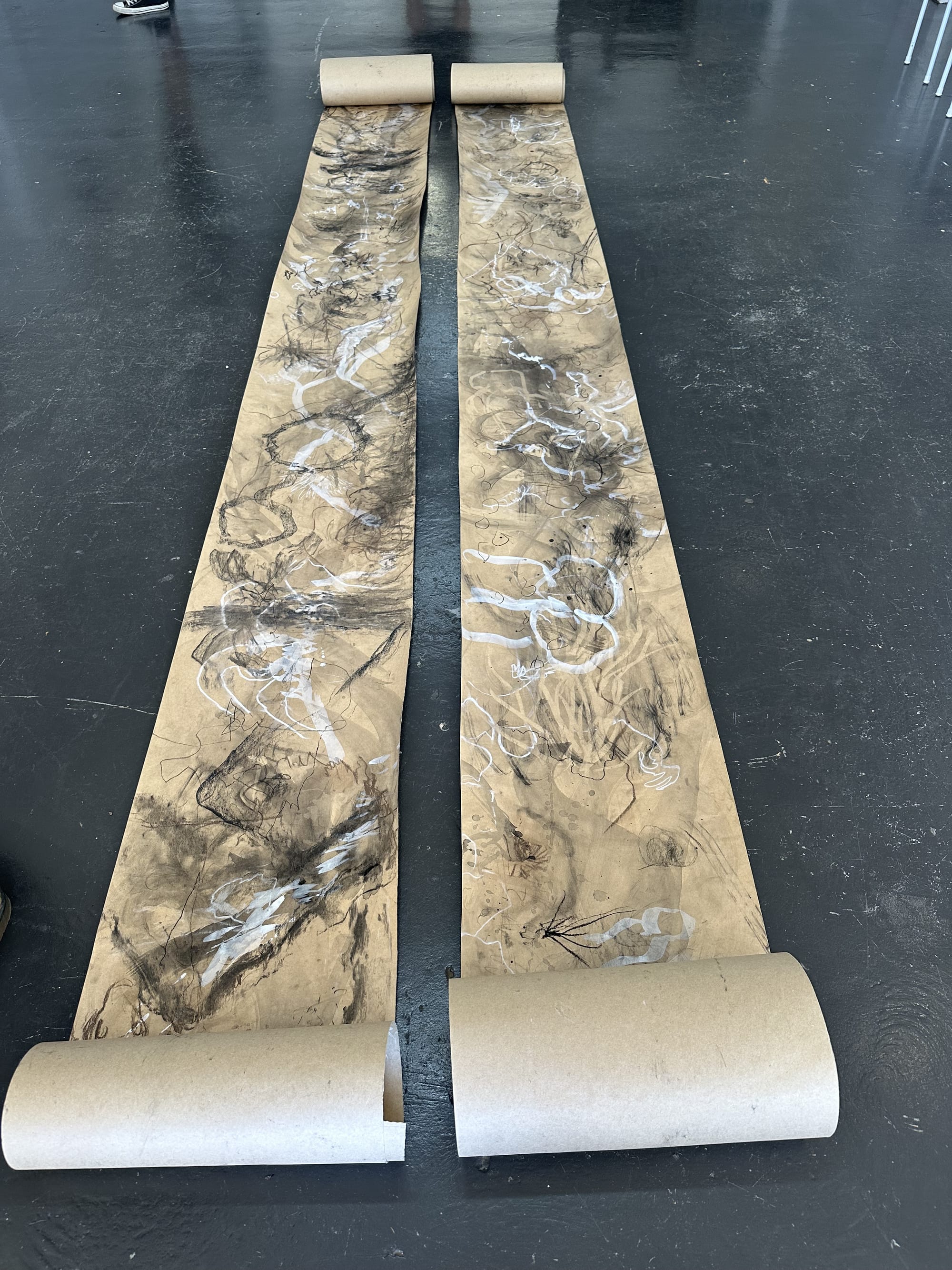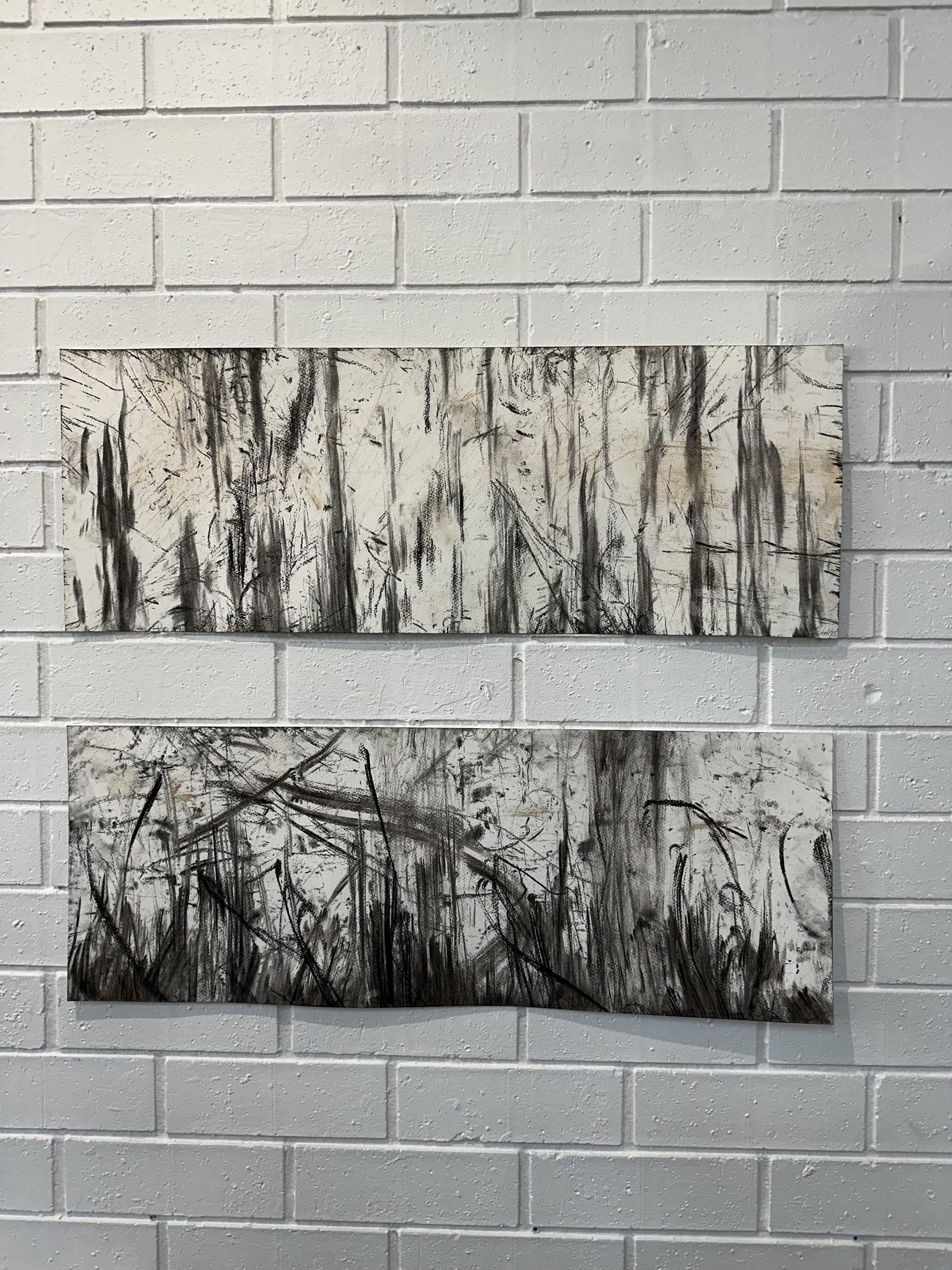 I enjoyed the gestural quality in When We Burn (2025) the most. Consisting of four smaller horizontal panels of thick paper with charcoal markings, this work has movement and narrative, where Shul seems more of an exploration. When We Burn was a collaboration with ecologist Craig Dunne on Yuin Country in Moruya NSW, an area impacted by the 2019/20 black summer bush fires. The duo dragged the paper through the landscape which had recently been cool burned as part of a fire management program. While none of this is apparent on simply looking, the works do evoke a landscape with their soft and hard black vertical and horizontal lines. The four together tell a story of movement, reminding me of fire.