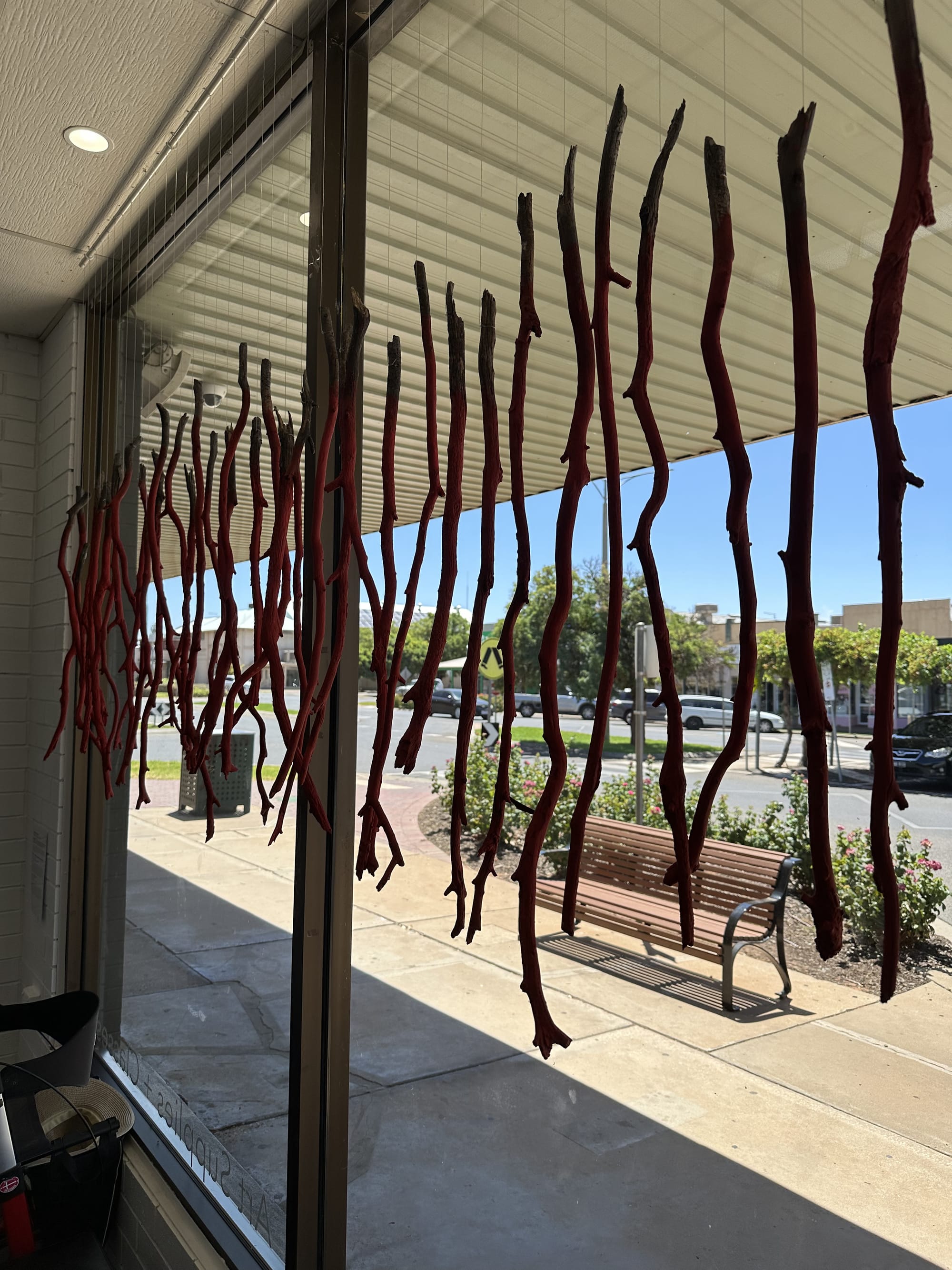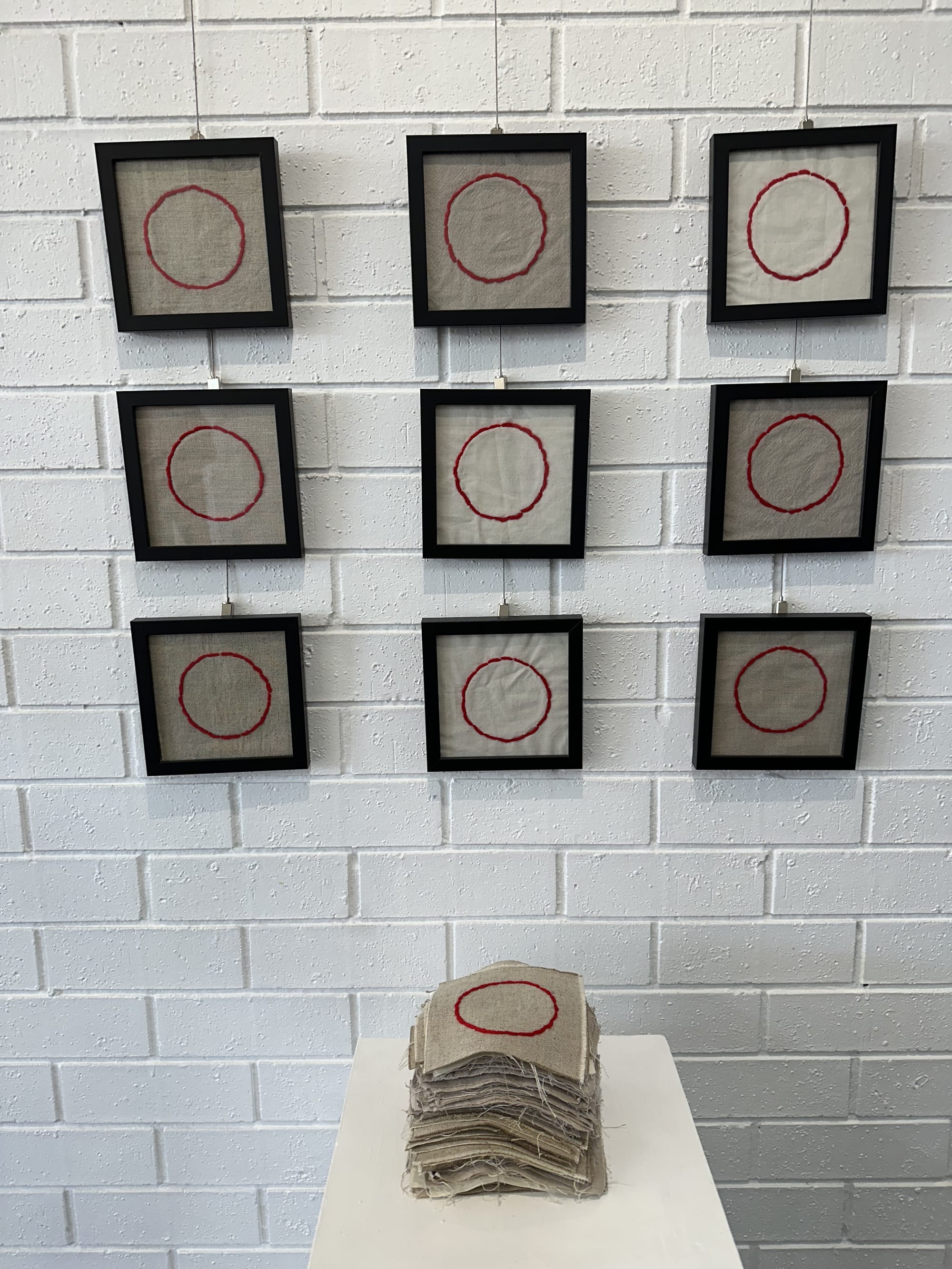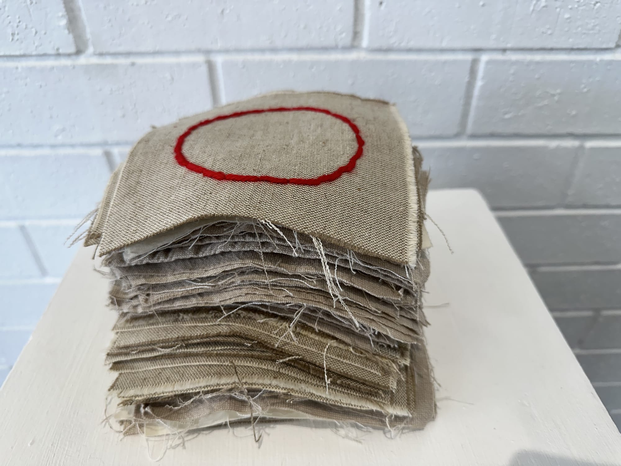 These observations find resonance in The Divine, The Void, The Infinite (108 Circles for Radical Fields), (2024), a durational stitching performance inspired by the Zen practices at Glenlyon’s Radical Fields and Castlemaine Zen (Djarra Country). Using found yarn and fabric, Kendrigan stitched 108 circles in red thread after participating in a Zen walk. The circles are displayed in a stack with their edges fraying, and they seem to wait for the craftsperson’s hands to return. Some circles are framed and displayed on the wall. Symbolism here isn’t derived from the landscape specifically, instead the numbers hold significant meaning to different religions and practices from across the world.