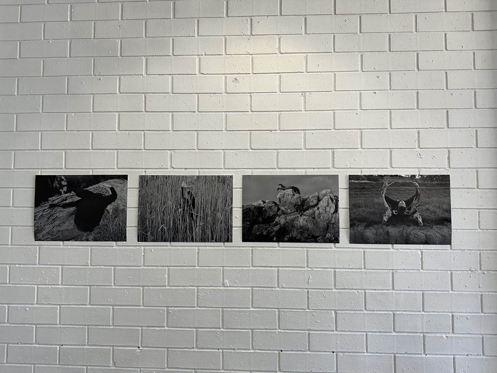 Kendrigan is a performance artist, and this exhibition features the marks resulting from different performances in different media from charcoal to frottage to photography and embroidery. Using a methodology called Body Weather, designed to “develop a conscious relation to the state of change inside and outside the body”, Kendrigan’s approach is often dictated by what they find in each location. This responsiveness is clear in the titular work Shul (2025) in which they drew blindfolded while conjuring the memory of time spent at Bibbaringa Farm in Bowna NSW from the floor of Wagga Wagga Art Gallery. The resulting large-scale scrolls are marked with charcoal and what looks like white chalk or gauche in chaotic and meandering patterns. The types of marks made while standing and wielding a long stick with the chalk attached can only be random and gestural as the performance takes on a durational dynamic.