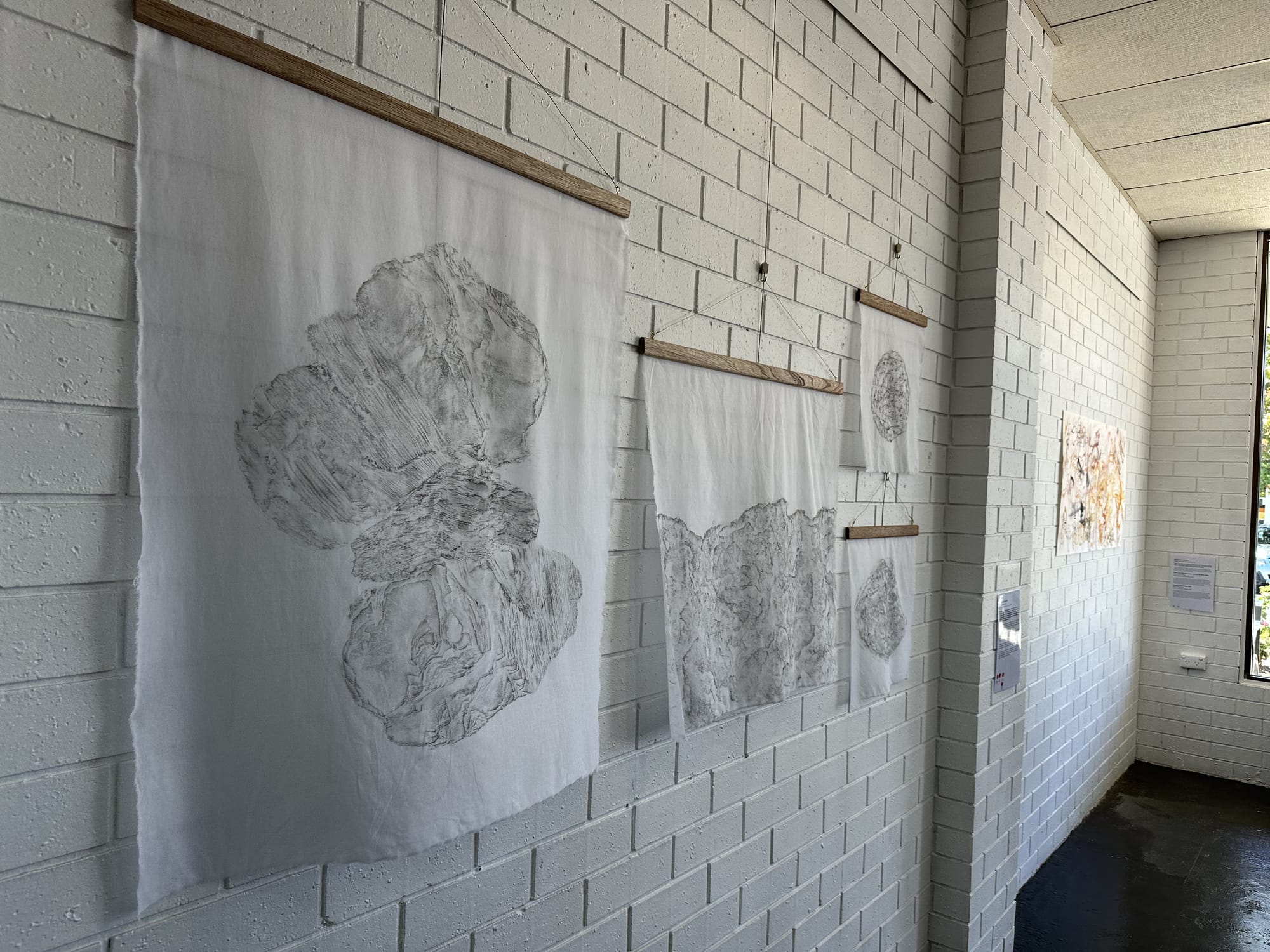 L-R: Rhae Kendrigan The Holding Place, photographs of performance (2025); Gondwana Coast (graphite on muslin cloth) (2026); Forming a River's Edge (2024) (author's photographs).