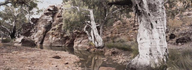 Fossil Waterhole was taken on a station in far western New South Wales, the land of the Malyangapa people. She is a Barkandji woman with Afghan, Irish and English ancestors and for her current exhibition at the Broken Hill City Art Gallery she has brought a series of photographs home to Country. While undertaking a residency at the Fowler’s Gap Arid Zone Research Station in 2011, Cumpston spent days photographing the evidence of Aboriginal occupation still visible in spite of past heavy agricultural use.